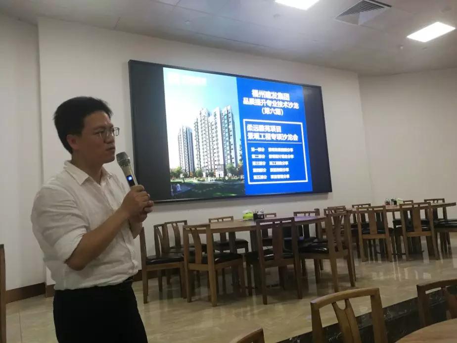 项目工作部以分享项目管理为主,由集团柔远雅苑项目经理林雨宗主讲。他从业主单位角度出发,与大家交流了景观方案评审的重要性、合图的关键性、园林班组专业性、各参建单位配合度、苗木的选材把关等景观工程管理要点。