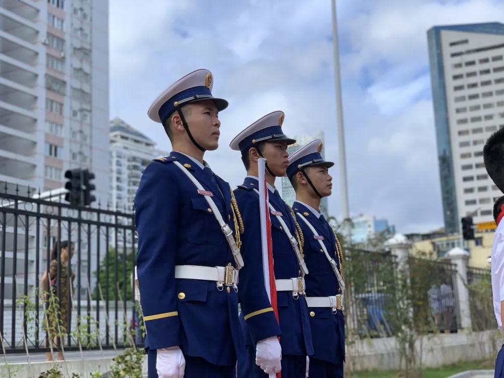 在全体人员的注目礼之下,英姿飒爽的国旗护卫队们迈着铿锵步伐,护送五星红旗入场。伴随着庄严的国歌,五星红旗冉冉升起、迎风飘扬。在场人员郑重敬礼,齐唱国歌,深怀着对祖国无限热爱和崇高敬意,共同迎接新中国70华诞。